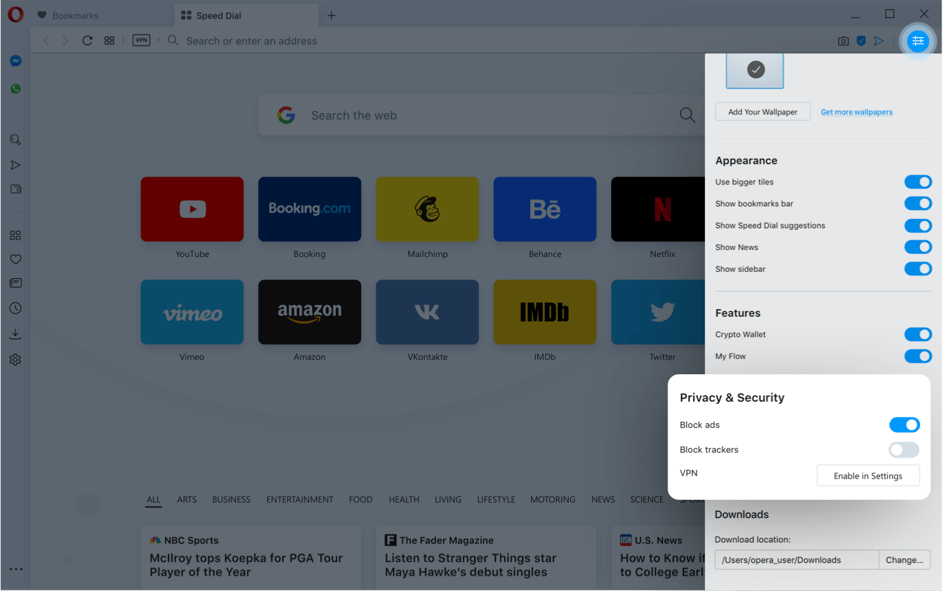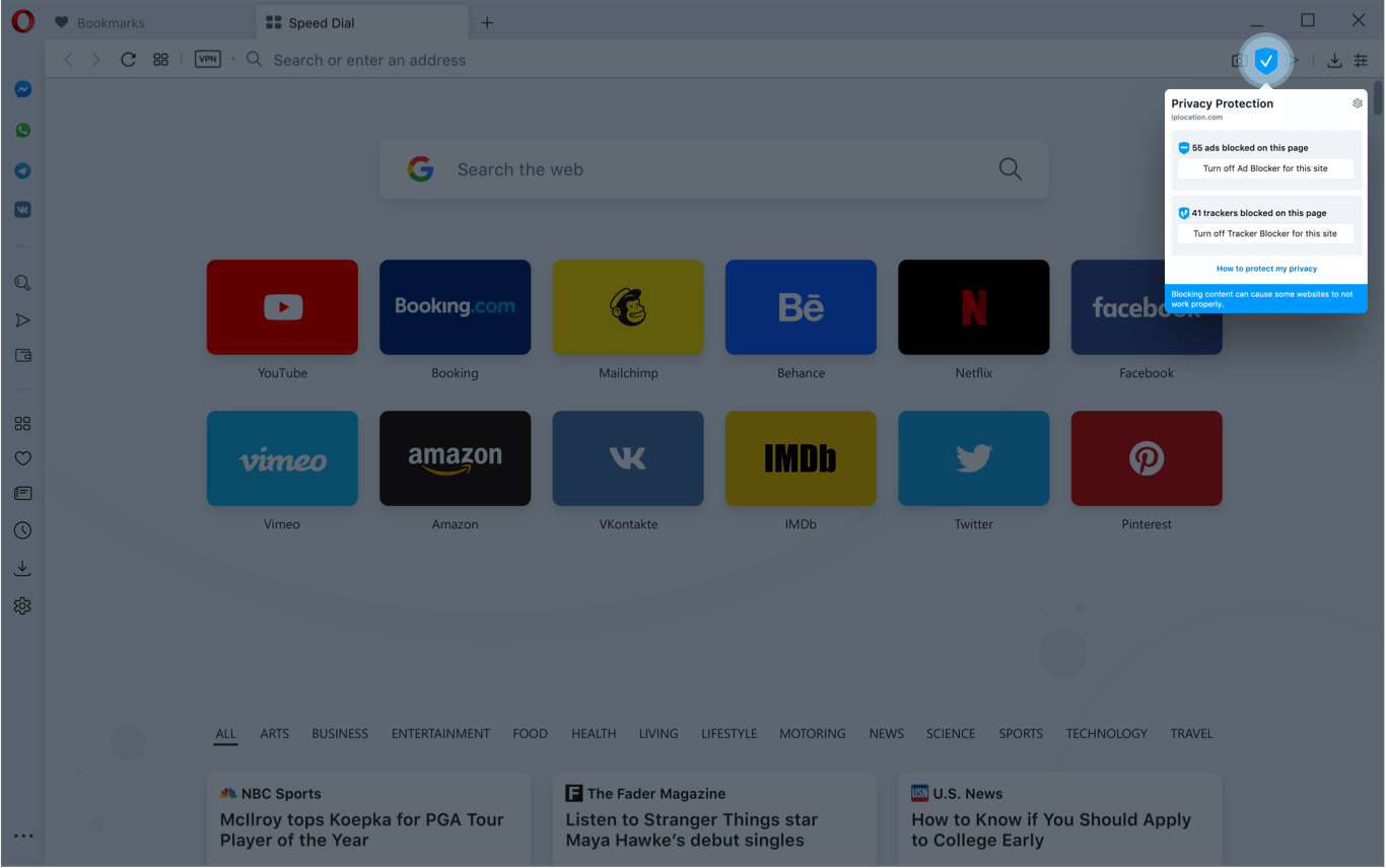 Opera’s ad blocker doesn’t just remove irritations and distractions online. If you’re on a limited data plan, ad blocker can save you a great amount of your mobile data. Slow page loading, even in the best private browser, is often the result of ads and the analytics code that accompanies them, so blocking them has a noticeable result. Most importantly, Opera’s ad blocker also stops the increasing number of malicious ads that can harm both your computer and your data security.
