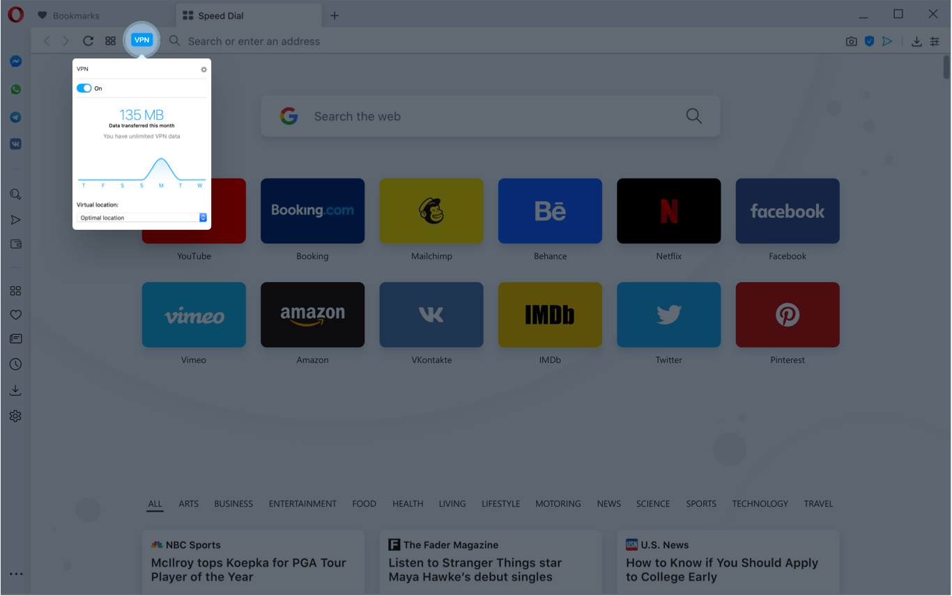 When Opera’s secure browser VPN is enabled, you can click on the VPN badge at the left end of your address bar for a VPN menu. From there, you can turn your VPN on or off, change virtual locations and see relevant security information.